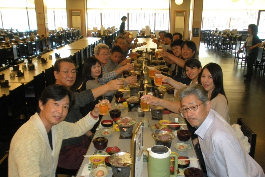 | バスの中で既に”できあがっている”人もチラホラ伺えますが(笑)、コチラに来たからには「松阪牛」を食べずにはおさまりがつきません。食べたのは「松阪牛のすき焼き」で、他にも一品料理が数品あり、最後はうどんで締めるという、たいへん満足のお昼ご飯でした。 |