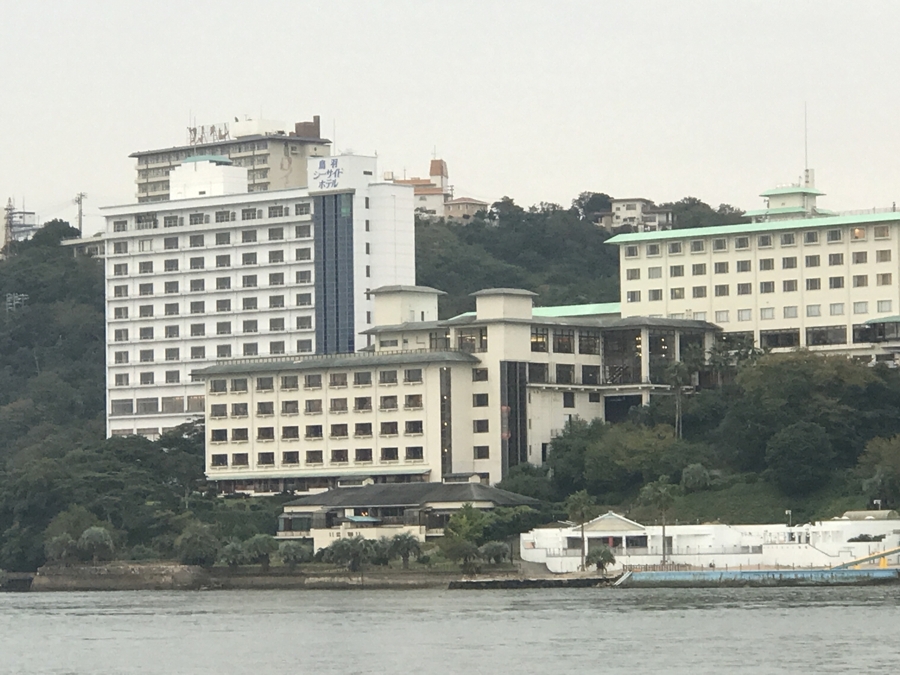 ミキモト真珠島から見える「鳥羽シーサイドホテル」です。三つの建物が一つに繋がり、それぞれの棟に趣の異なる大浴場があって楽しめました。