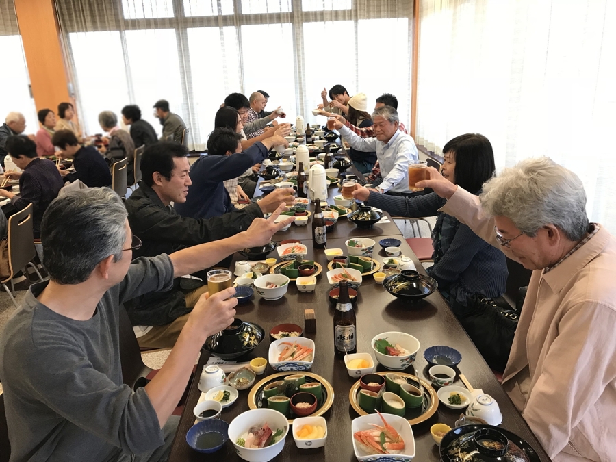 | 台風22号の影響で生憎の雨模様でしたが、予報では四国の南沖を通過するとのことだったので、山陰地方なら大丈夫だろうと、まずは例年のごとく「乾杯!!」から弊社の慰安旅行は始まります。(笑)これもバス旅行の醍醐味ですね。 |