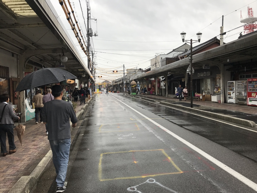| 場所を移して水木しげるロードにてお土産の物色です。心配された台風も雨が降ったり止んだりの程度だったので良かったです。ここは寂れた商店街だったのが、NHKの朝ドラ「ゲゲゲの女房」のヒットにより活性化されたとのことですが、我が徳島にも何人かの有名人(笑)がいるので、東新町に○○ロードとか作れないものでしょうかね?(笑) |