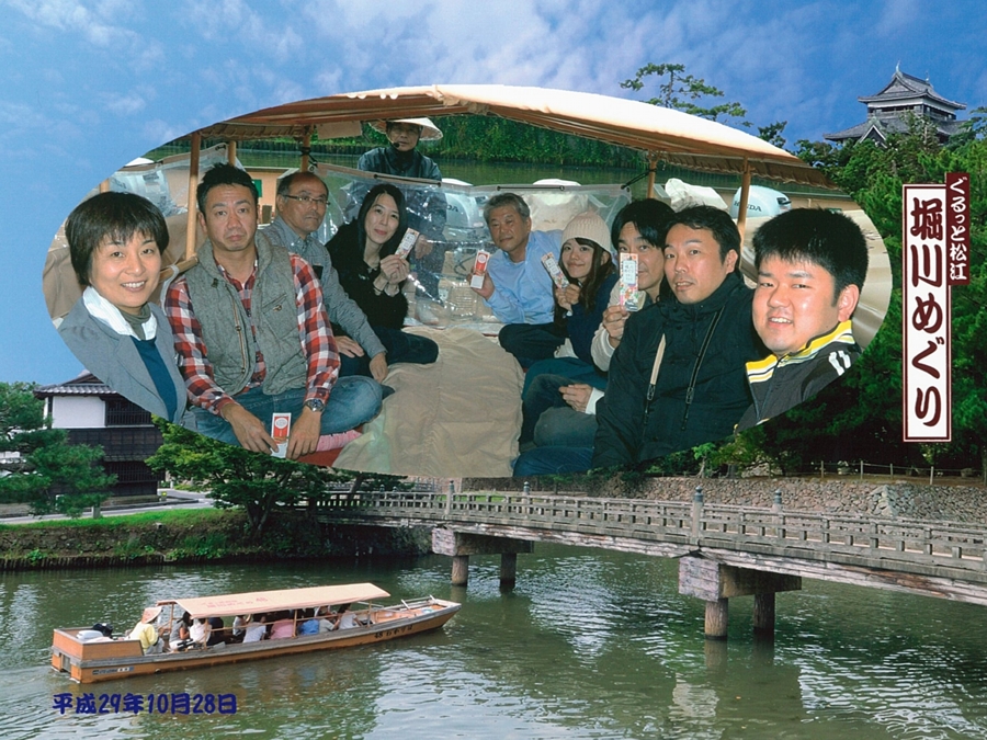 | 遊覧船に乗って松江城の外堀をめぐりました。多少の雨でも屋根が付いてるので問題ないですが、橋によっては桁下の低いところがあり、屋根が下がるのと同じようにお辞儀?をしないと通れません。船頭さんの歌声は素晴らしかったですが、島根県でなぜ吾亦紅と千春の歌だったのかは不明です。(笑)オマケ写真 |